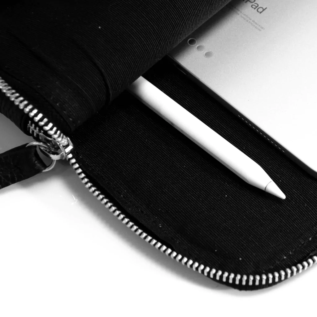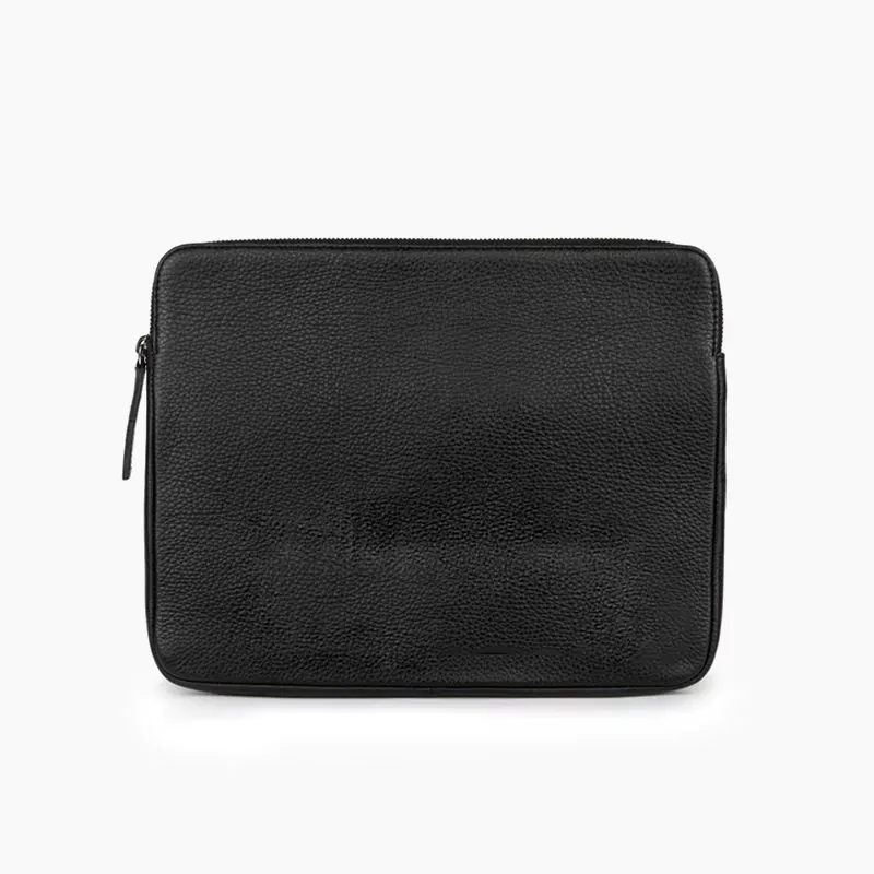 Estuche de cuero vacuno graneado con nuevo cierre y tira cierre de marca YKK. El estuche sirve para llevar documentos y laptops de hasta 15 pulgadas. Interior forrado en microfibra  con relleno de espuma poliestireno para protección.
